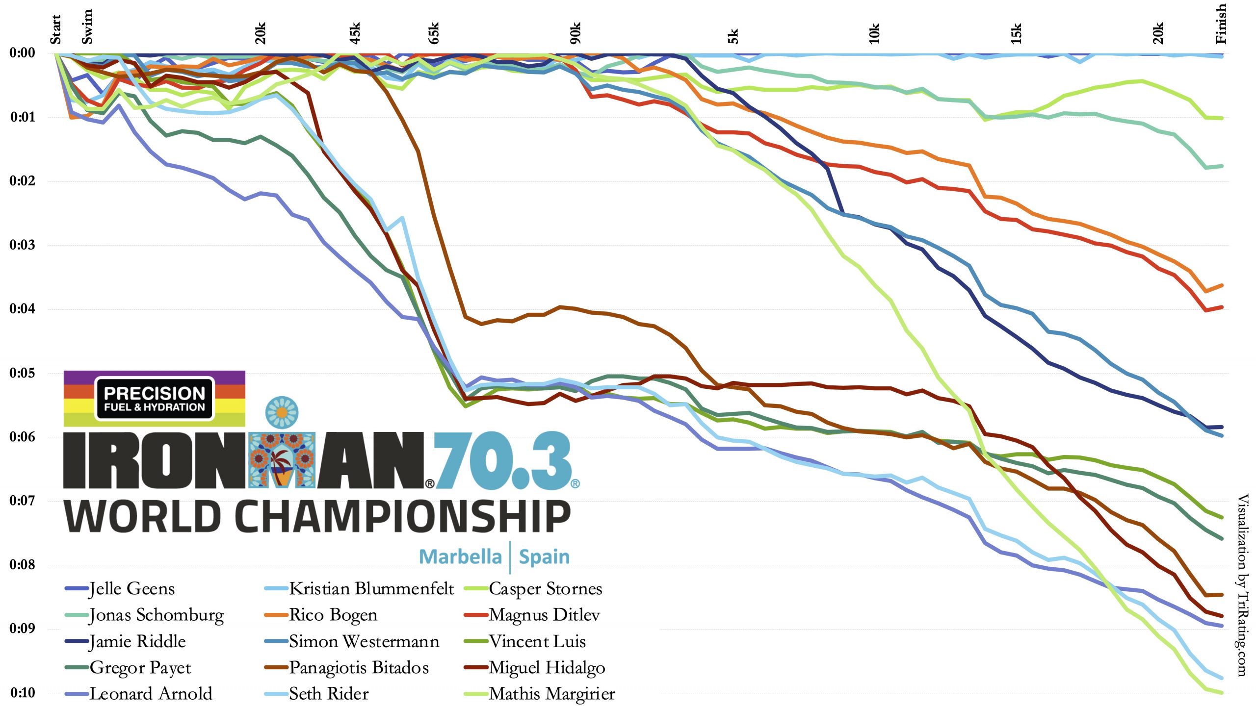 • The three leading men on the bike (Hayden Wilde, Marten van Riel and Mathis Margirier) did an extra lap on the bike which (at least for now) is not included in their bike times. (They have a T2 time of about 11 minutes, compared to sub-1-minute T2s for the rest of the field.)